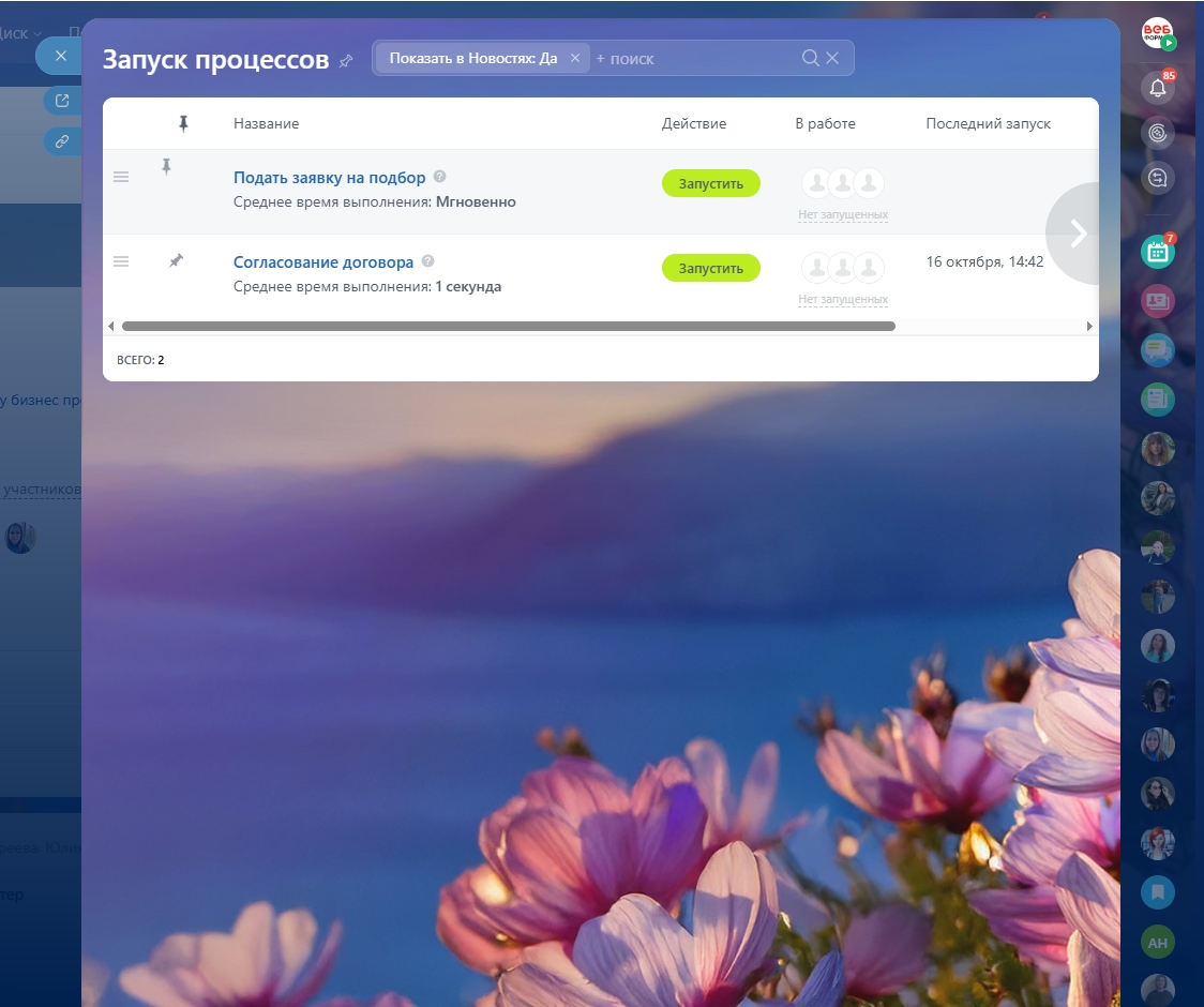 Сотрудник‑инициатор запускает бизнес‑процесс «Согласование договора» прямо из Ленты новостей. В один клик открывается мастёр‑форма — это снижает порог входа и дисциплинирует запуск из единой точки.
