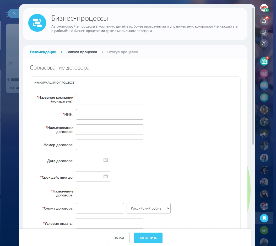 Сотрудник‑инициатор запускает бизнес‑процесс «Согласование договора» прямо из Ленты новостей. В один клик открывается мастёр‑форма — это снижает порог входа и дисциплинирует запуск из единой точки.