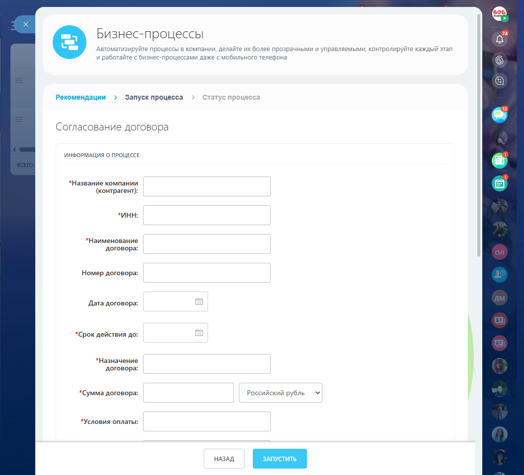 Для упрощения старта процесса была создана интерактивная форма «Подача заявки на согласование договора», доступная прямо из ленты новостей Bitrix24.