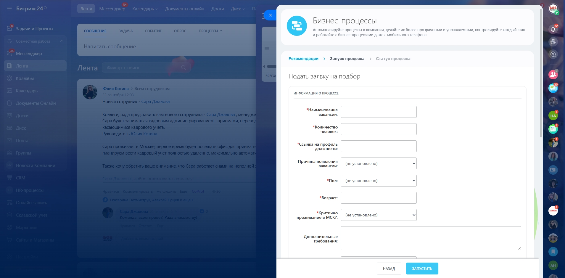 Форма «Подать заявку на подбор» и запуск бизнес‑процесса согласования