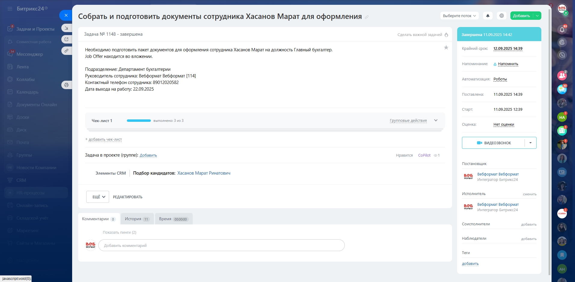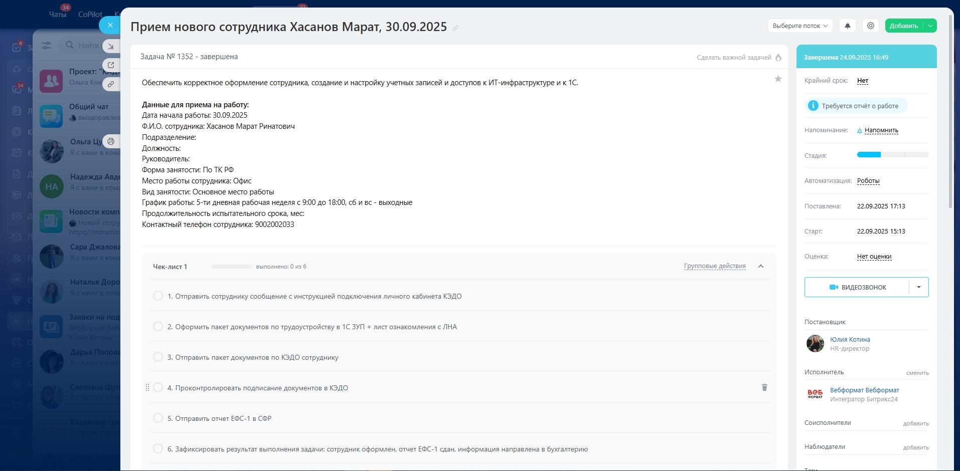 - Автозапуск задач на оформление и онбординг снижает ручные операции и риски срывов сроков.