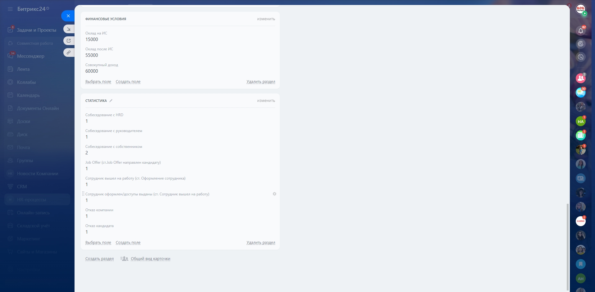 - Автопостановка задач на оформление и онбординг при переходе кандидата на стадию «Оформление сотрудника».