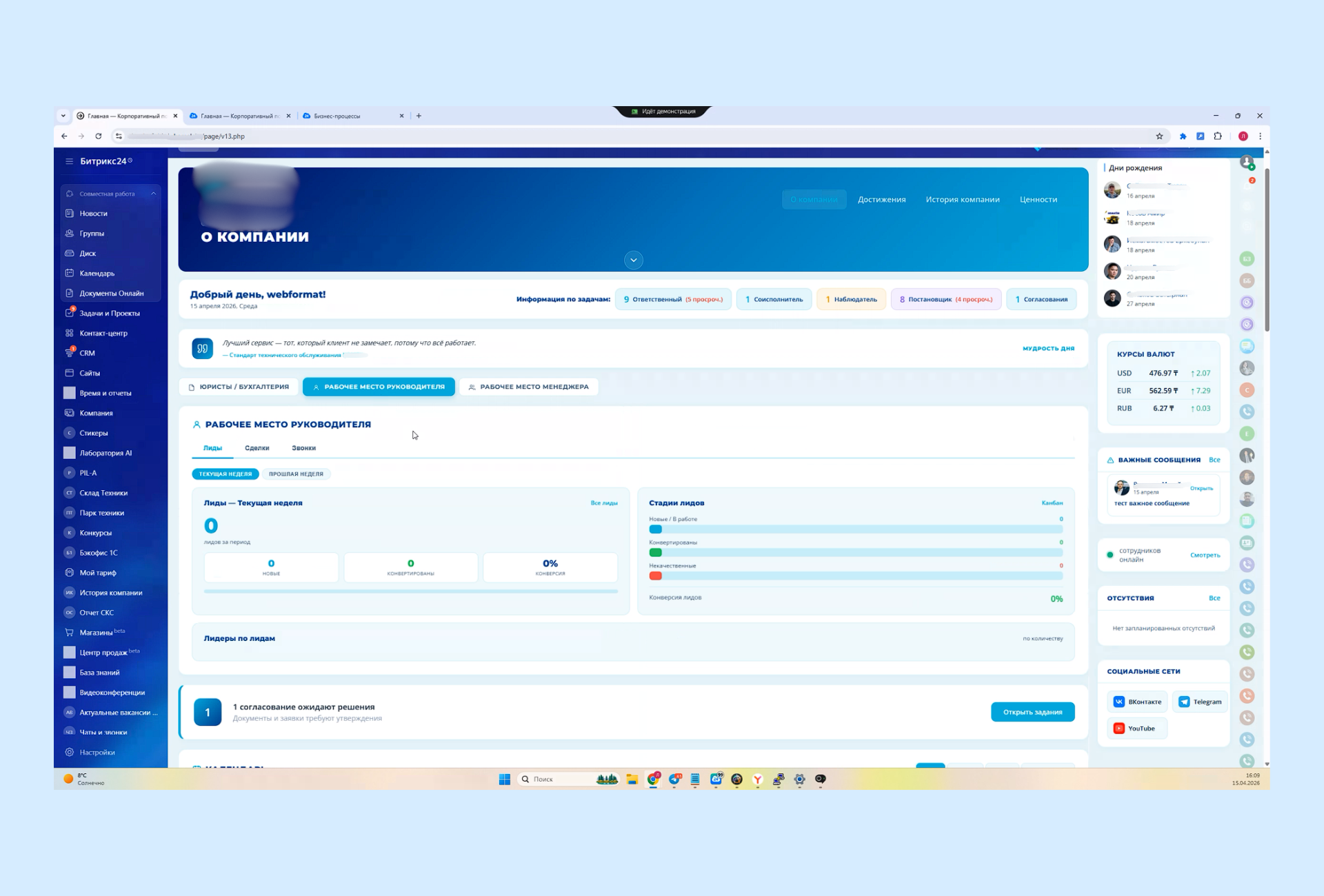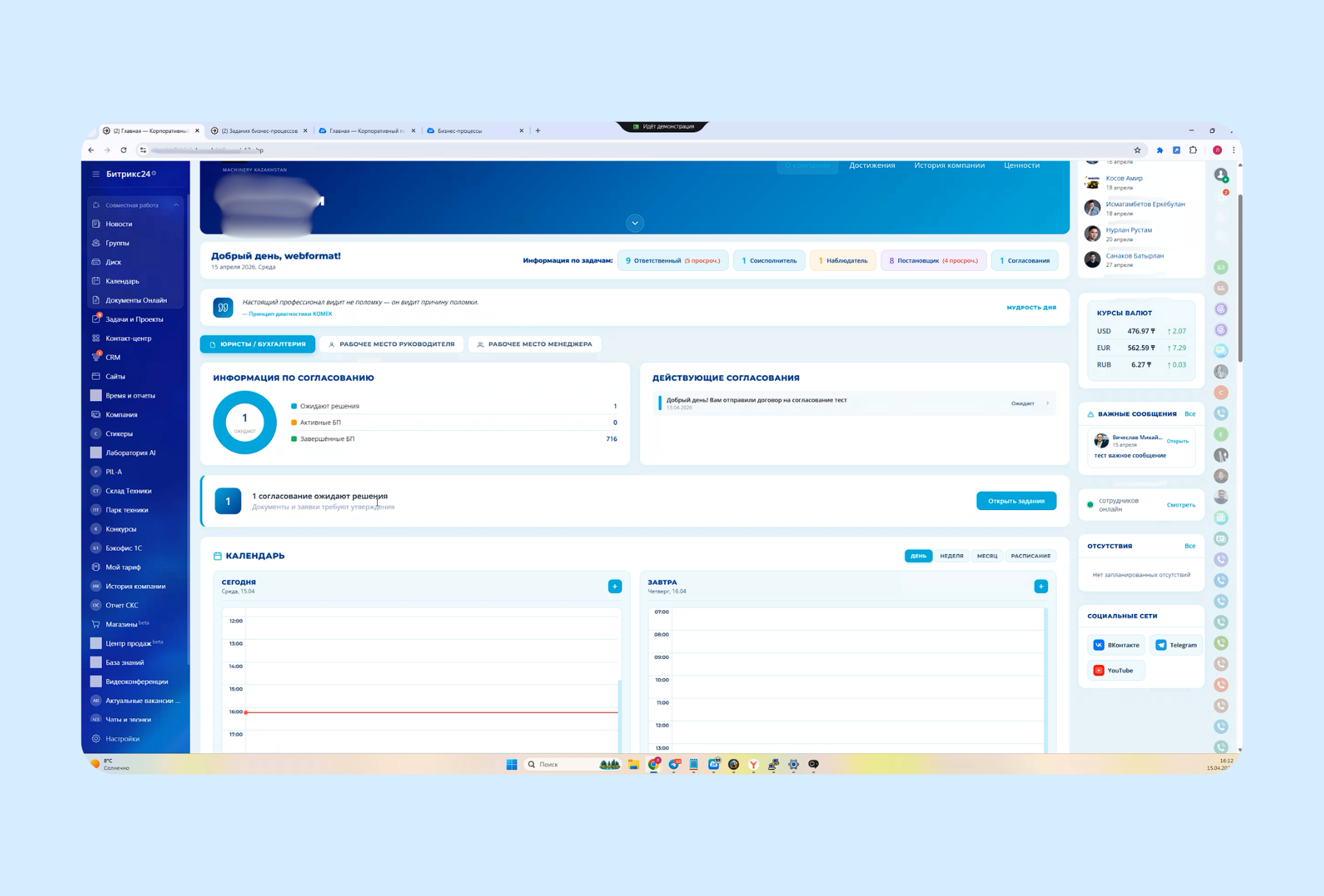 На этом же экране собраны блоки, которые помогают не упускать текучку: кто просрочил задачи, какие согласования ждут решения, какие события стоят в календаре, какие уведомления требуют внимания прямо сейчас. Для компании с большим количеством внутренних операций такой формат сильно снижает потери внимания. И, честно говоря, в этом вся ценность подобных решений.