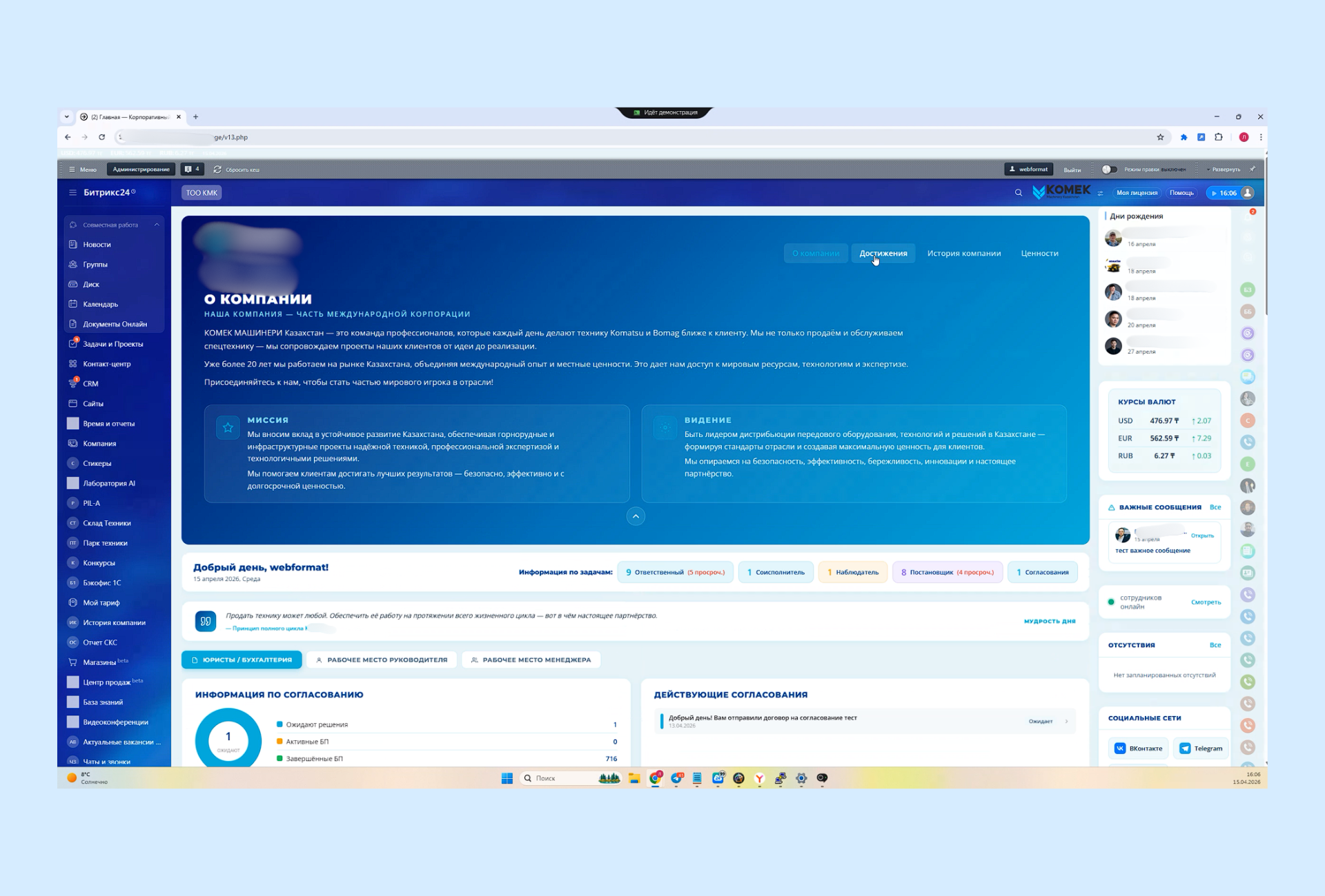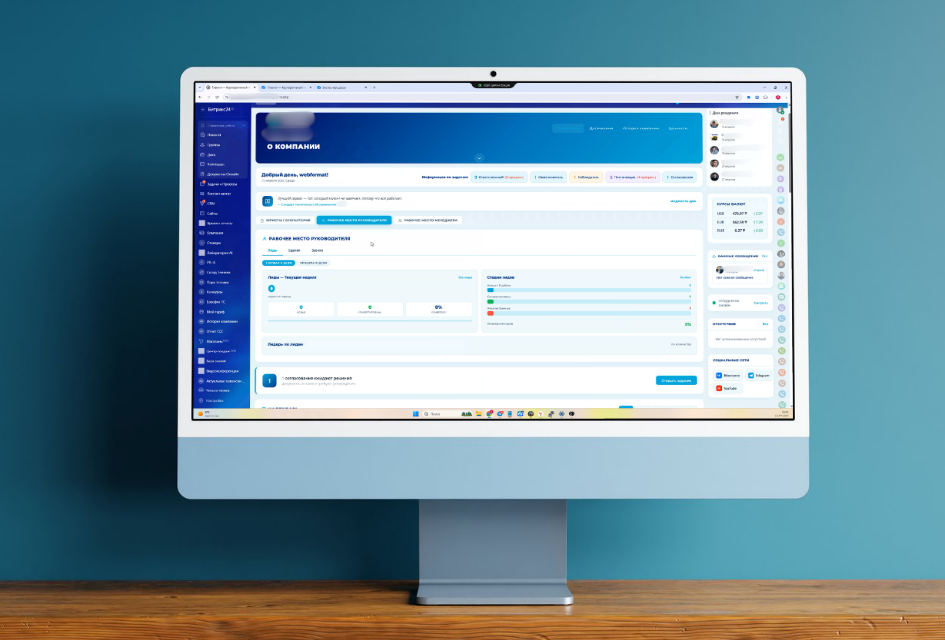 Мы собрали для клиента дашборд в коробке Битрикс24, который стал точкой входа в ежедневную работу. На главном экране сотрудник сразу видит ключевые блоки: важные сообщения, информацию по задачам, действующие согласования, календарь, курсы валют, быстрые переходы в профильные разделы и отдельные рабочие зоны для разных ролей. За счет этого портал перестал быть просто внутренним сайтом. Он начал работать как центр управления текущими действиями.